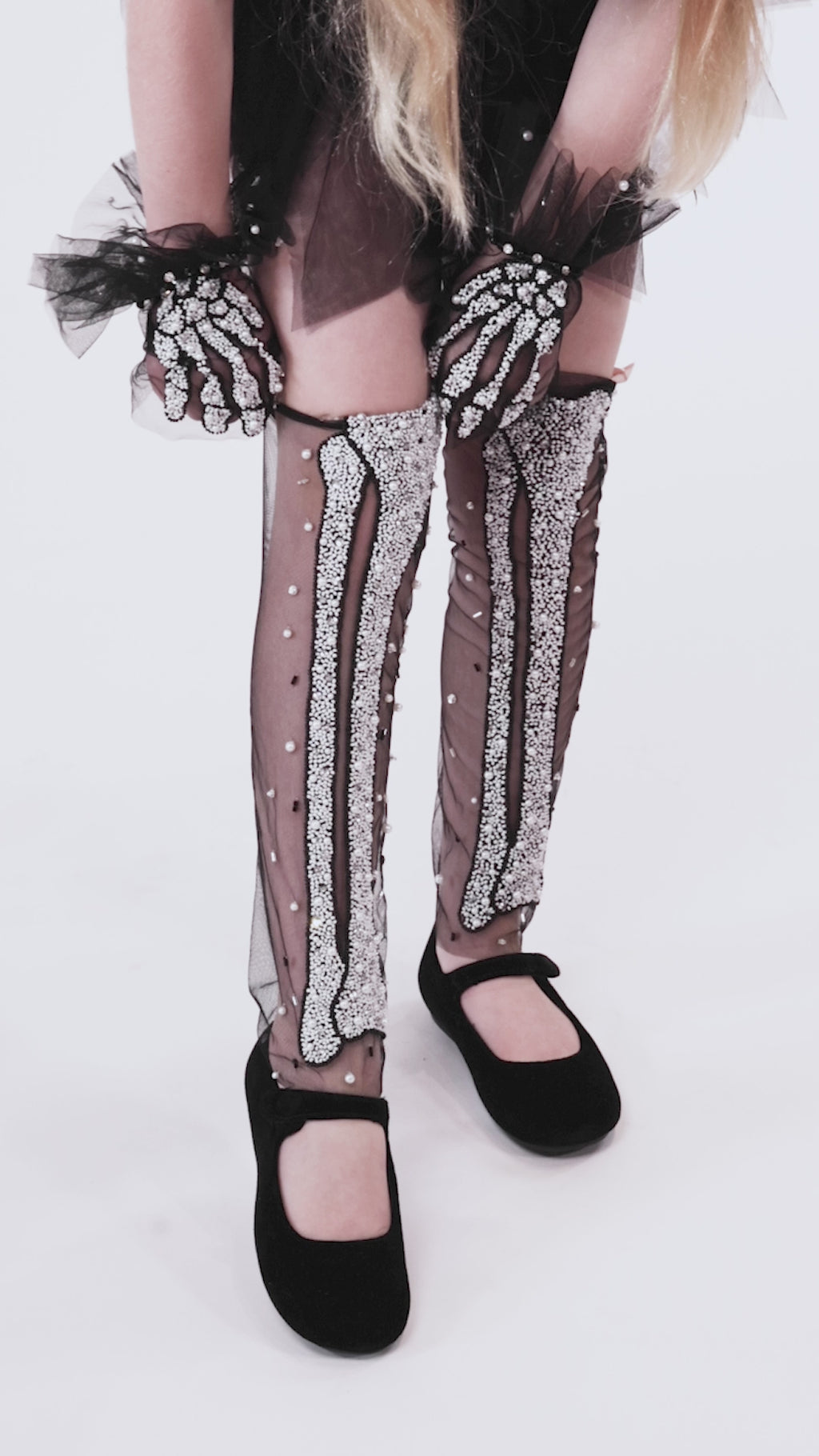 "The shin bones connected to the ankle bones..." The Bone Appetit Leggings in Black feature ghoulishly glitzy sequinned bones, hand applied onto super fine tulle by our skilled team of artisans.These stunning accessories are the perfect compliment to any Halloween outfit, especially our Bones & All tutu dress. Break a leg!