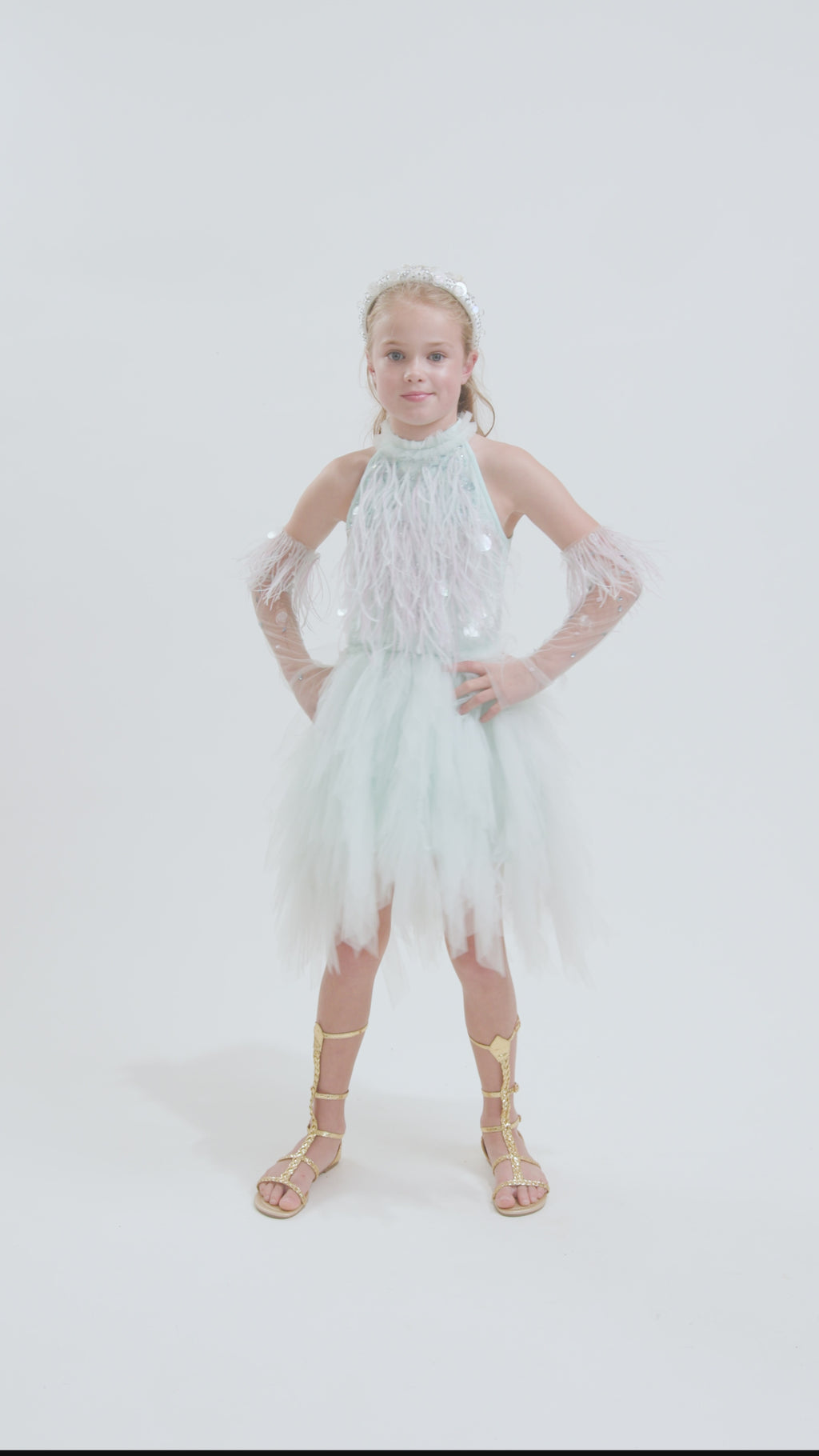 The Siren Song Tutu Dress in Pacific Coast glimmers like a dream made real. Feathery layers of tulle flow into a cloud-like skirt while sequins and gems shimmer across the feathered bodice A statement ruffled halter neckline makes it a gown of goddess-worthy elegance.