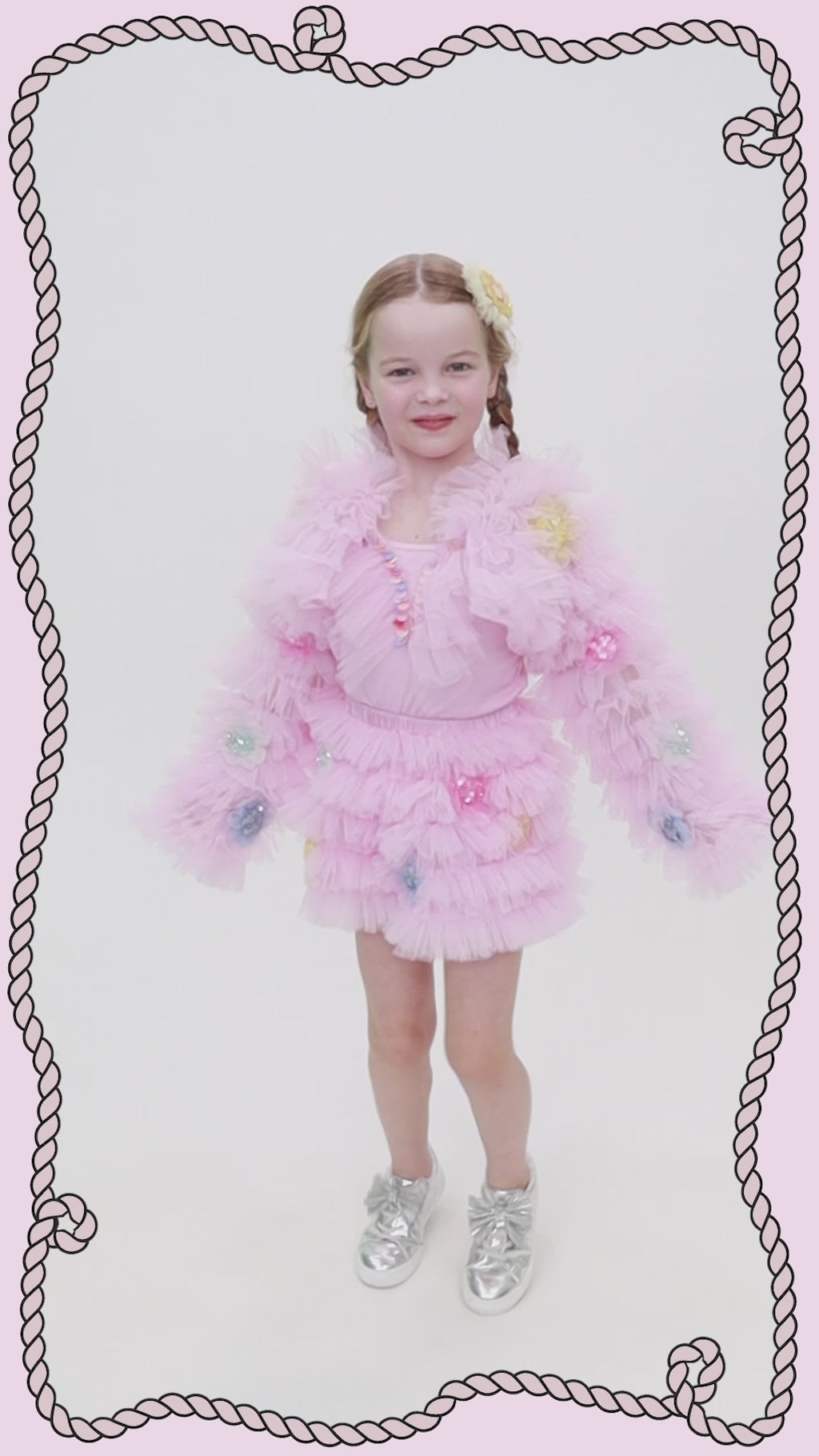 Wrap your little one in a field of fun with the Sunflower Power Shrug! The Sunflower Power Shrug is a colourful confection of candy floss–hued tulle, layered and lavishly gathered for extra bounce and flair. Sprinkled with bright sunflower embellishments in a rainbow of shades, this shrug is blooming with joy. It's the perfect finishing touch for any outfit, bringing a playful pop of colour and Wiggles-inspired energy to every adventure.