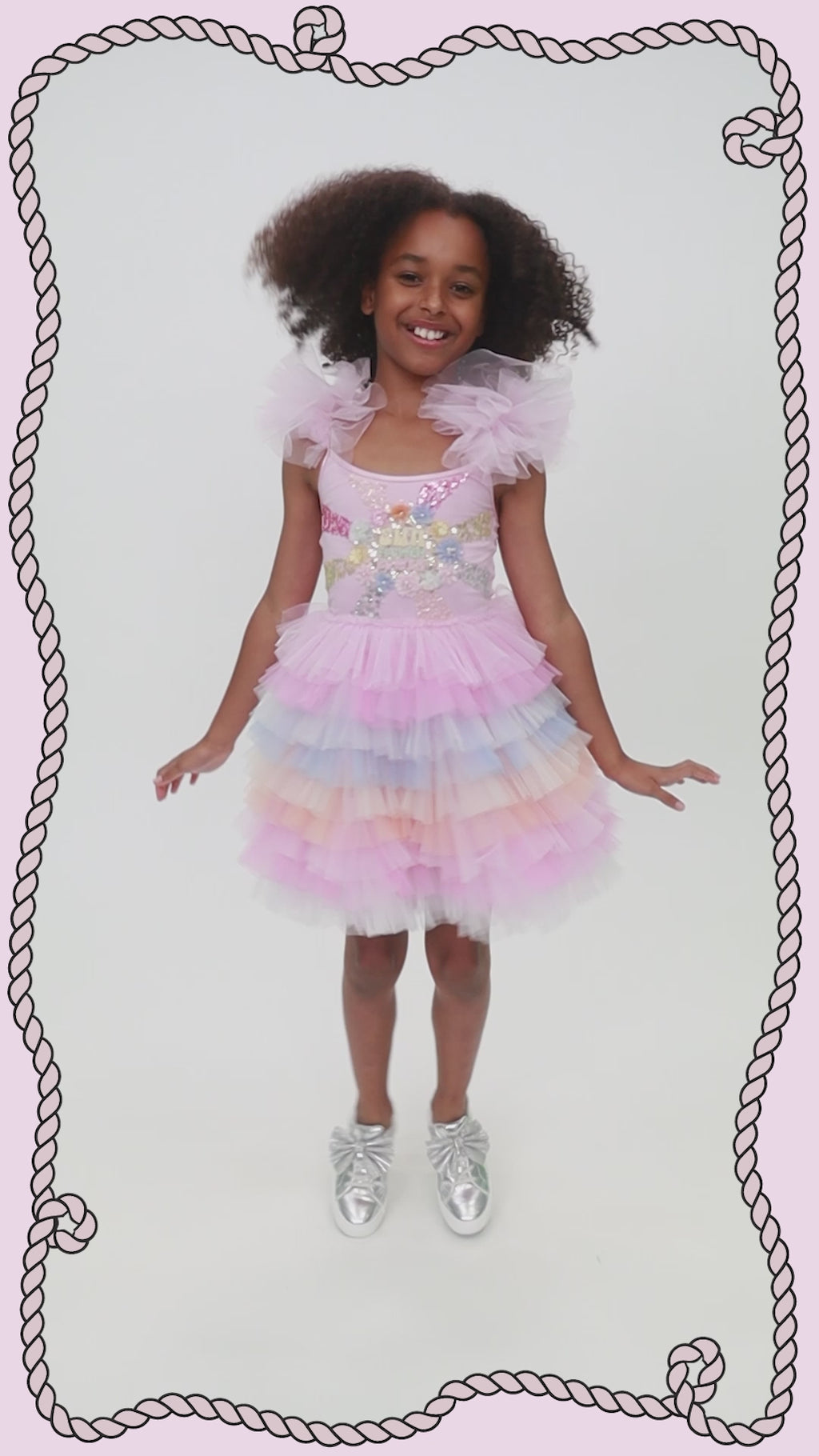 Bursting with joy and color, the Sunflower Power Tutu Dress in Candy Floss Mix is a celebration of sunshine and sparkle. A cascading kaleidoscope of rainbow layers makes up the full tulle tutu skirt, swirling with vibrant hues that twirl with every step. Soft tulle ruffles grace the straps, adding a delicate flutter with each movement. The bodice shines bright with the empowering phrase “Sunflower Power,” surrounded by cheerful sunflowers and shimmering sequin rays that sparkle like the sun’s warm glow.