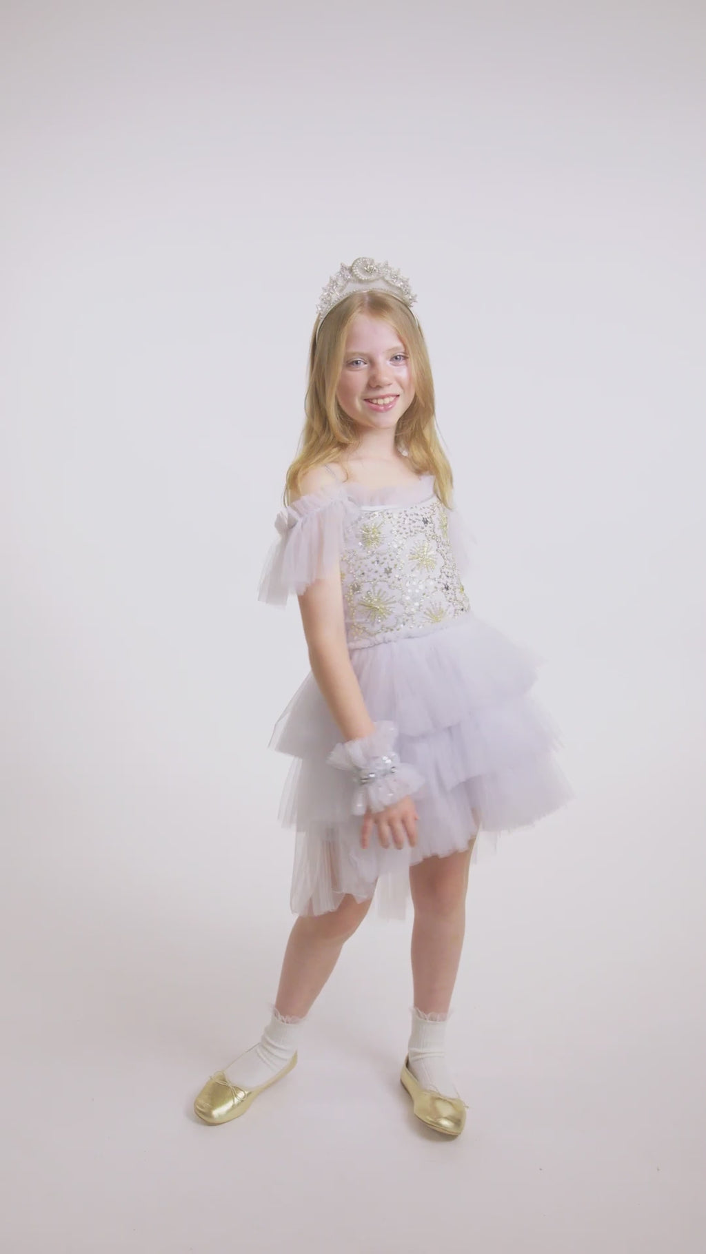 Get ready to dazzle with holiday magic in the Your Grace Tutu Dress in Silverlite! This stunning creation features shoulder-baring frills and a heavily bedazzled bodice ensuring you'll shimmer and shine throughout the festive season. The high-low layered hem adds an extra touch of glamour, making it the perfect choice for any holiday celebration!